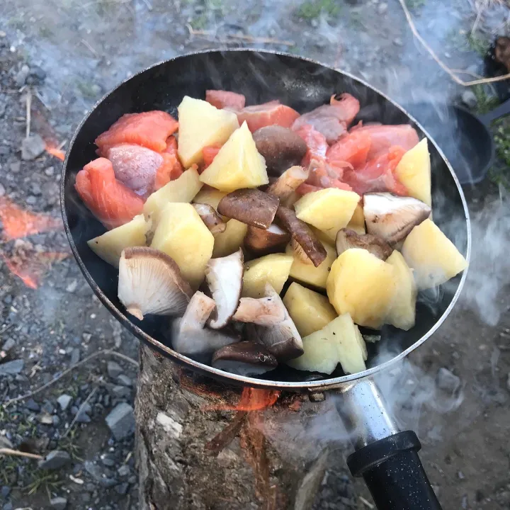 何より、薪をくべて楽しむ焚き火とは違い、丸太一本だけに着火している状態なので、金網やバーベキューコンロなどを必要としないのが嬉しいです。調理をするには、スウェーデントーチと着火するための木くず等があればOKです。