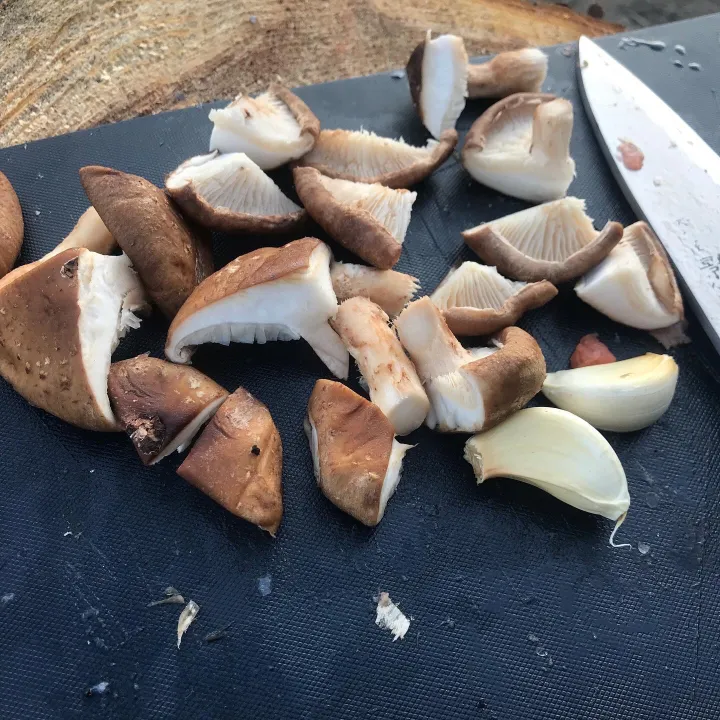椎茸とニンニクを適性のサイズにカットして下準備完了です。